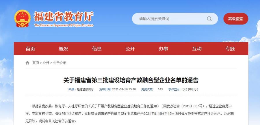 9月16日,省发改委、教育厅、人社厅联合公布了福建省第三批建设培育产教融合型企业名单,与我院合作办学的9家企业入选。