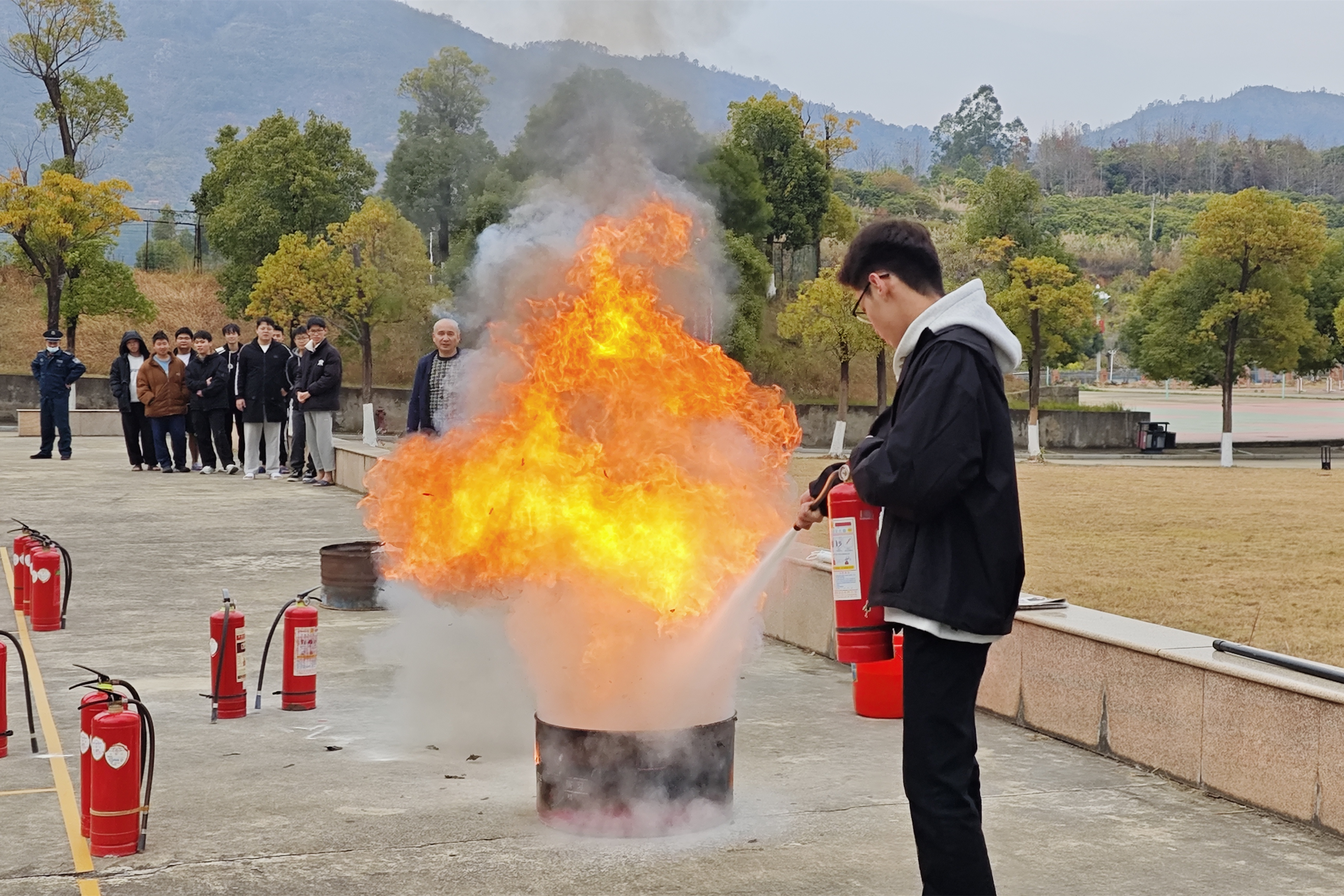 随后,学院物业、安保工作人员对在场师生进行消防知识普及与灭火器的使用讲解,通过现场对灭火器的使用演示并邀请师生亲身体验,切实提升消防意识和自救互救能力,保障校园安全稳定。